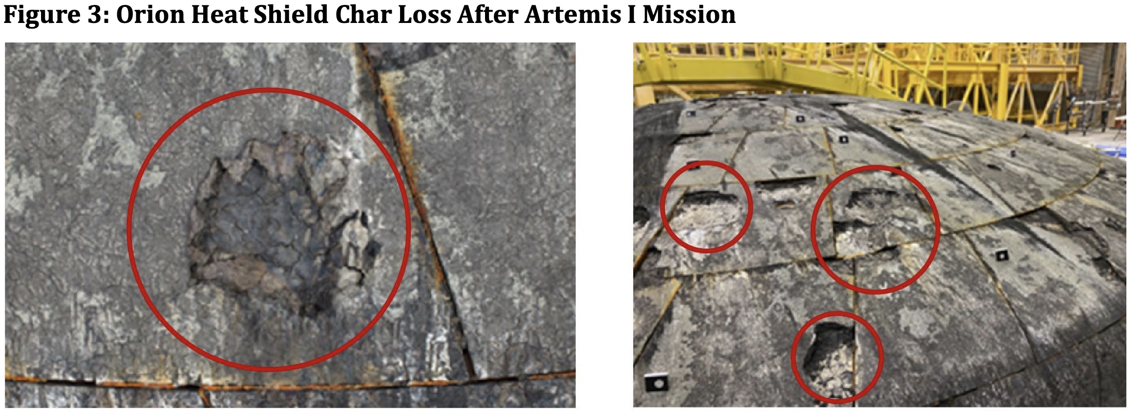 - Heat shield spalling. This is the technical term for all those divots. Since spalling leaves voids and gaps in the heat shield material, it can expose the unprotected body of the capsule and lead to burnthrough. Spalling also changes the pattern of hypersonic airflow around the capsule, creating the potential for localized hot spots and cascading effects.