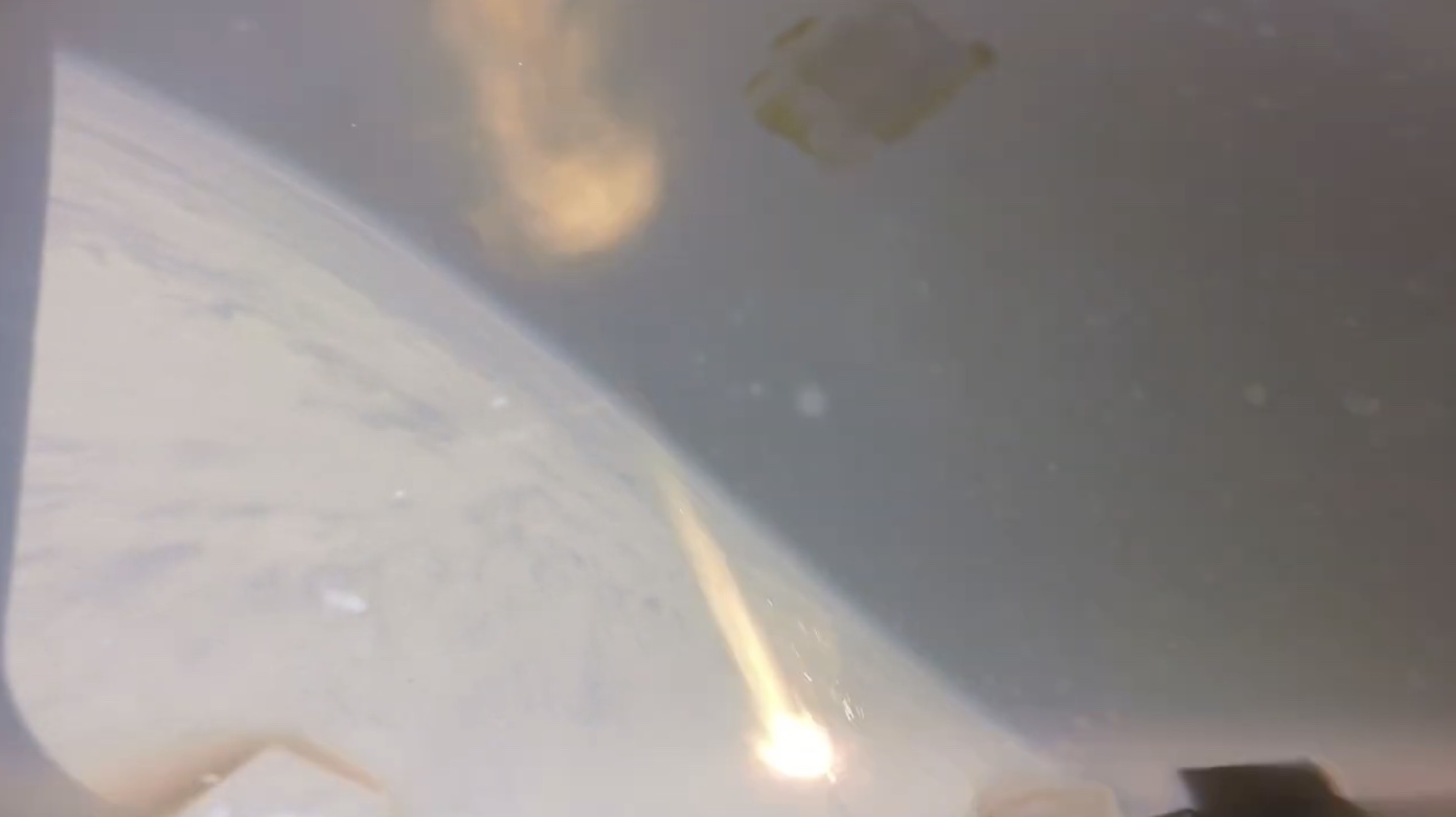 A screen shot from re-entry during Artemis I, showing a large burning fragment of the Orion heat shield